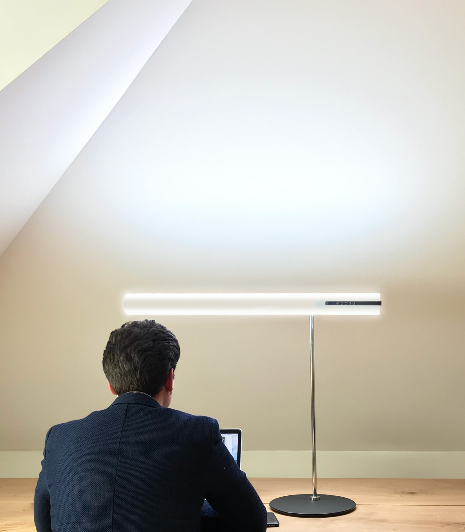 Hier geht es um die Fläche des Leuchtkörpers und der angestrahlten Wände. Da wir evolutionsbedingt auf den blauen Himmel reagieren, benötigen wir eine große Fläche, um die retinalen Ganglienzellen anzusprechen. Ein kleines Spotlight hätte z.B. nur wenig Wirkung. Deswegen ist die HEAVN One bewusst größer, als eine herkömmliche Schreibtischleuchte. Denn mehr Fläche ist mehr Licht im Auge. Und genau deshalb kann die HEAVN One mit ihren 3 Lichtrichtungen und Ihrer patentierten Geometrie eine so gute Wirkung zu entfalten.