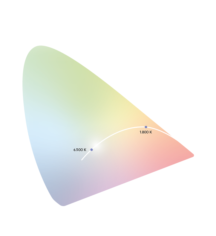 Über die Augen aufgenommene Lichts hat großen Einfluss auf verschiedene Körperfunktionen. Die Charakterisisierung des Spektrums erfolgt meistens über die wahrgenommene Farbtemperatur in Kelvin (°). In der Regel gilt: Je höher die Kelvinzahl, desto bläulicher (kälter) ist das Licht und desto mehr wirkt es wachmachend und aktivierend. Umgekehrt wirkt wärmes Licht stärker beruhigend und entspannend. Schmalbandiges Licht? Nicht bei uns! Im Gegensatz zu günstigen RGB-Technologien, nutzen wir hochwertige LED-Module mit breiten und sich über den Tagesverlauf verändernden Spektren. Denn Tageslicht is Vollspektrumlicht und ständiger Veränderung ausgesetzt.